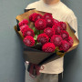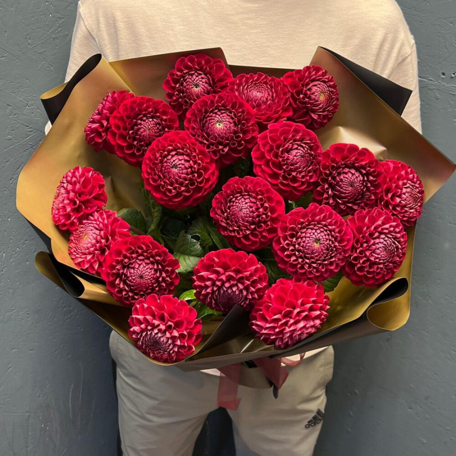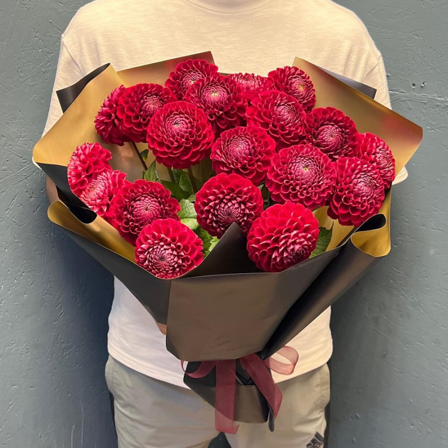 На фото букет из 19 красных георгин. В составе: георгина 19 шт, крафт-бумага 1 шт, атласная лента 1 шт, . Все цветы свежие и ароматные, букет красиво оформлен и отлично подходит для подарка. Доступна доставка цветов или самовывоз.