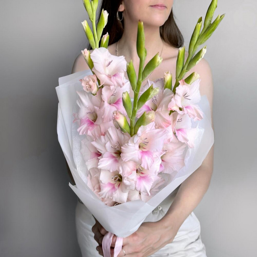 На фото букет из 3 розовых гладиолуса. В составе: гладиолус 3 шт, дизайнерская упаковка 1 шт, атласная лента 2 шт, . Все цветы свежие и ароматные, букет красиво оформлен и отлично подходит для подарка. Доступна доставка цветов или самовывоз.