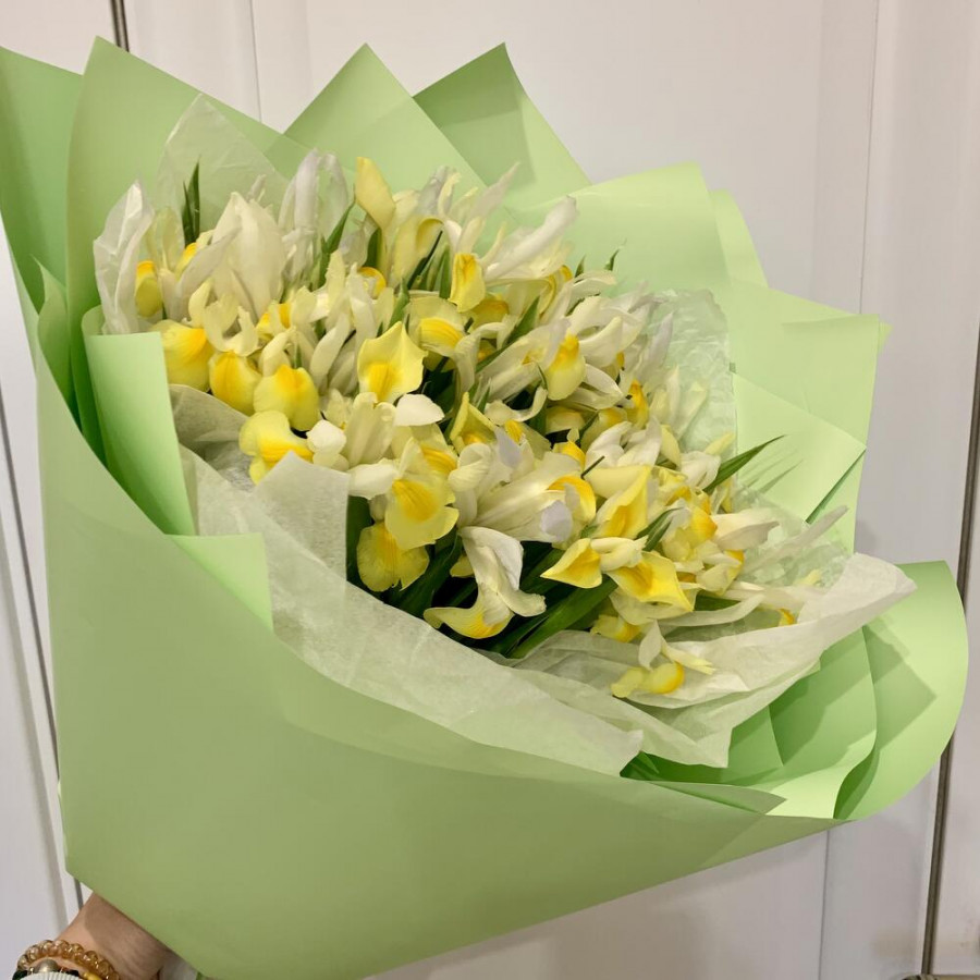 На фото букет из 49 желтых ирисов. В составе: ирис 49 шт, дизайнерская упаковка 1 шт, брасика 1 шт, . Все цветы свежие и ароматные, букет красиво оформлен и отлично подходит для подарка. Доступна доставка цветов или самовывоз.