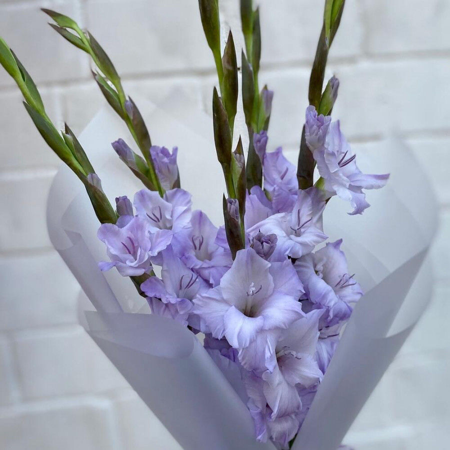 На фото букет из 5 сиреневых гладиолусов. В составе: гладиолус 5 шт, дизайнерская упаковка 1 шт, . Все цветы свежие и ароматные, букет красиво оформлен и отлично подходит для подарка. Доступна доставка цветов или самовывоз.