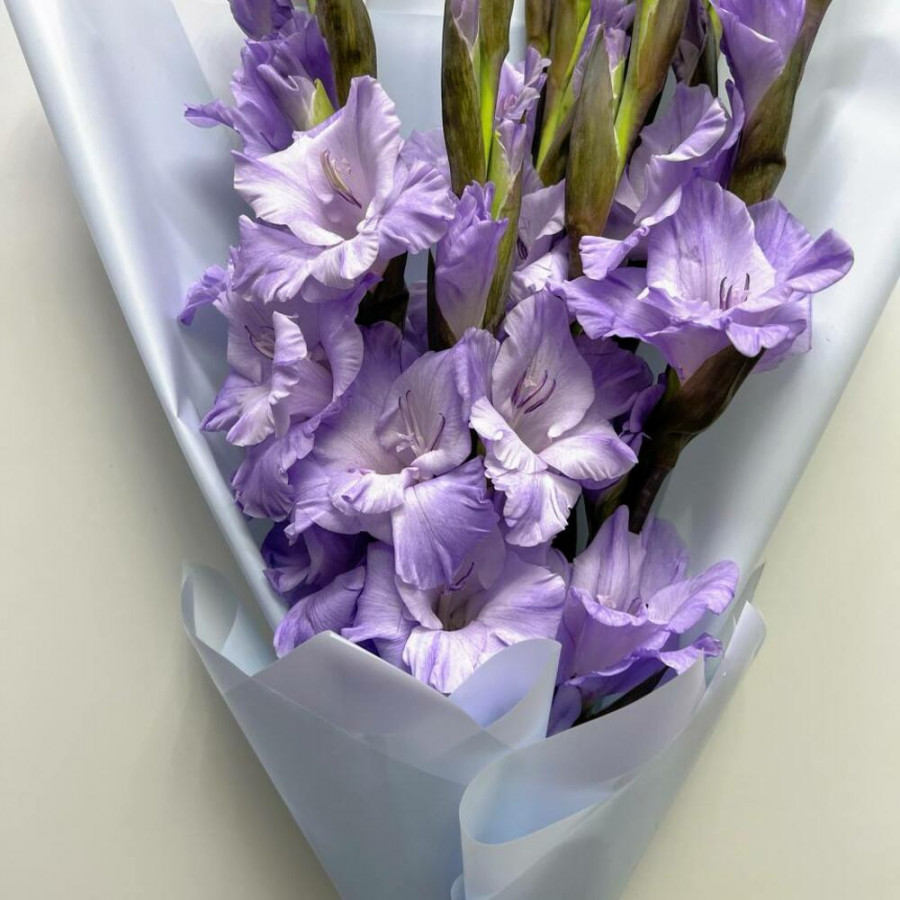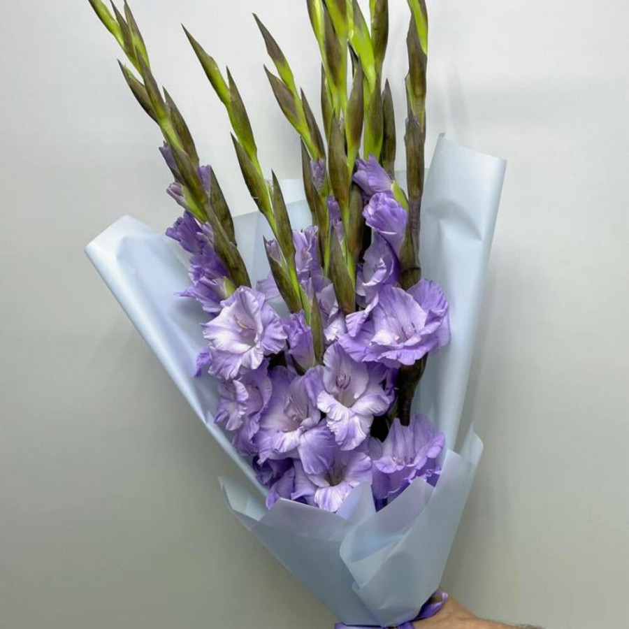На фото букет из 9 лиловых гладиолусов. В составе: гладиолус 9 шт, дизайнерская упаковка 1 шт, . Все цветы свежие и ароматные, букет красиво оформлен и отлично подходит для подарка. Доступна доставка цветов или самовывоз.