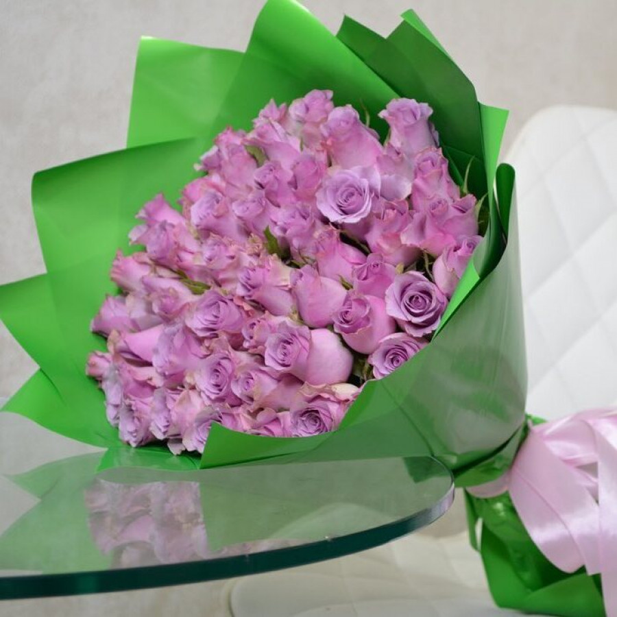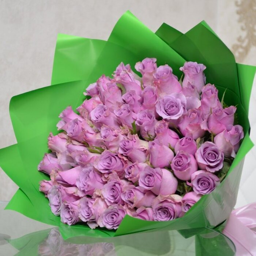На фото букет из 51 сиреневой розы. В составе: роза 51 шт, крафт-бумага 1 шт, атласная лента 1 шт, . Все цветы свежие и ароматные, букет красиво оформлен и отлично подходит для подарка. Доступна доставка цветов или самовывоз.