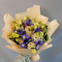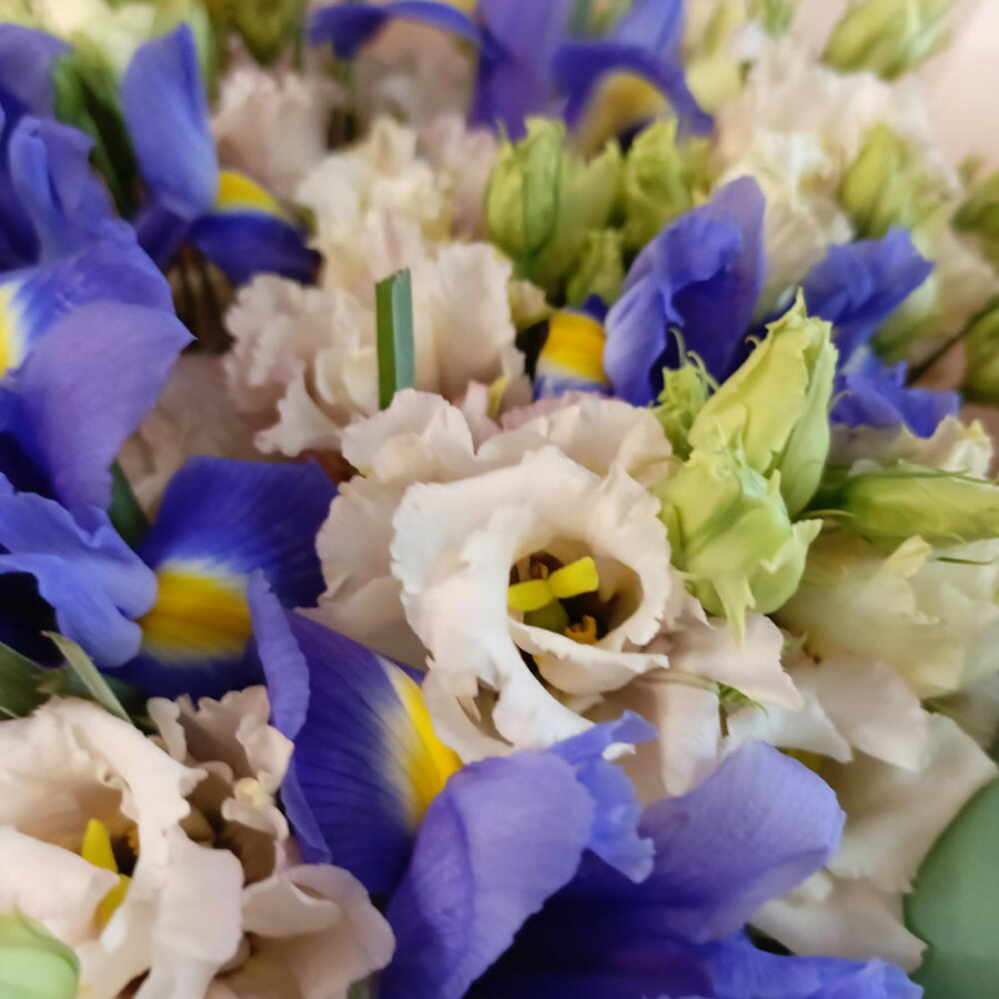 На фото букет из синих ирисов и кремовых эустом. В составе: ирис 5 шт, эустома (лизиантус) 4 шт, дизайнерская упаковка 1 шт, атласная лента 1 шт, . Все цветы свежие и ароматные, букет красиво оформлен и отлично подходит для подарка. Доступна доставка цветов или самовывоз.