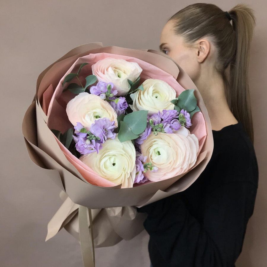 Букет из розовых ранункулюсов и сиреневой матиолы в Шелехове