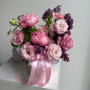 На фото цветочная композиция с сиренью и пионами. В составе: сирень 2 шт, эустома (лизиантус) 3 шт, диантус 5 шт, антирринум 3 шт, оазис флористический 2 шт, шляпная коробка (m) 1 шт, атласная лента 1 шт, . Все цветы свежие и ароматные, букет красиво оформлен и отлично подходит для подарка. Доступна доставка цветов или самовывоз.
