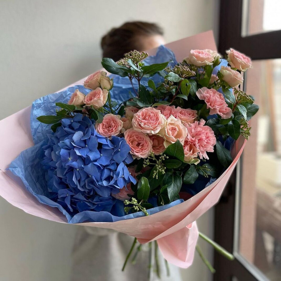 На фото голубая гортензия и пионовидные розы. В составе: гортензия 1 шт, кустовая пионовидная роза 6 шт, скиммия 2 шт, крафт-бумага 1 шт, атласная лента 1 шт, . Все цветы свежие и ароматные, букет красиво оформлен и отлично подходит для подарка. Доступна доставка цветов или самовывоз.