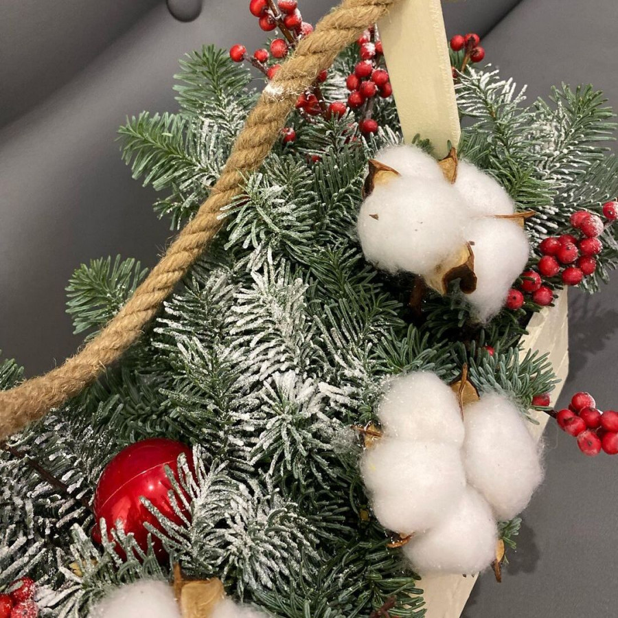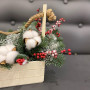 На фото новогодняя композиция в деревянном ящике. В составе: рябина 3 шт, еловая ветка 2 шт, хлопок 3 шт, деревянный ящик (s) 1 шт, . Все цветы свежие и ароматные, букет красиво оформлен и отлично подходит для подарка. Доступна доставка цветов или самовывоз.